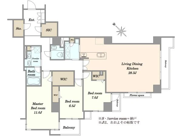 専有面積135.28㎡という都心では希少な広さ。3LDKに加え、3つのウォークインクローゼットとSICを備えた高い収納力が特徴です。